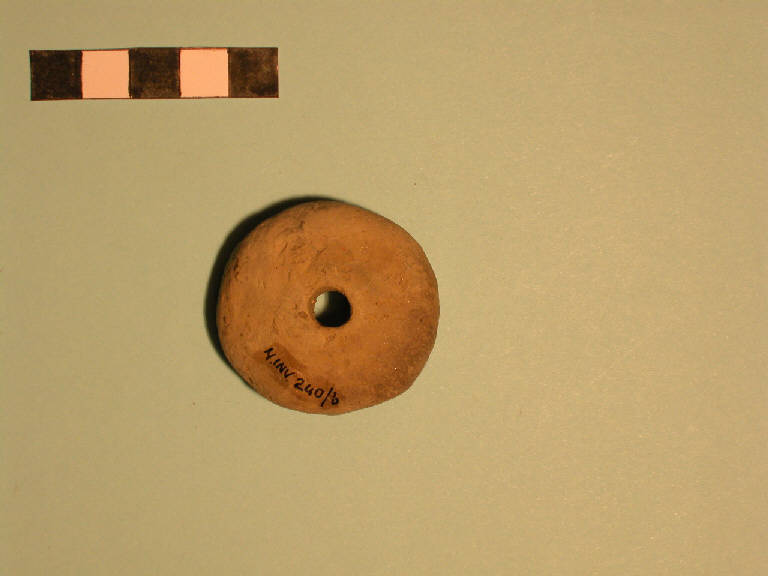 Fuseruola discoidale, base piatta, lati leggermente convessi, rilievo in corrispondenza del foro centrale sulla faccia superiore.