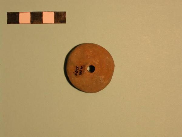 Fuseruola discoidale, base piatta, lati convessi, rilievo in corrispondenza del foro centrale sulla faccia superiore.