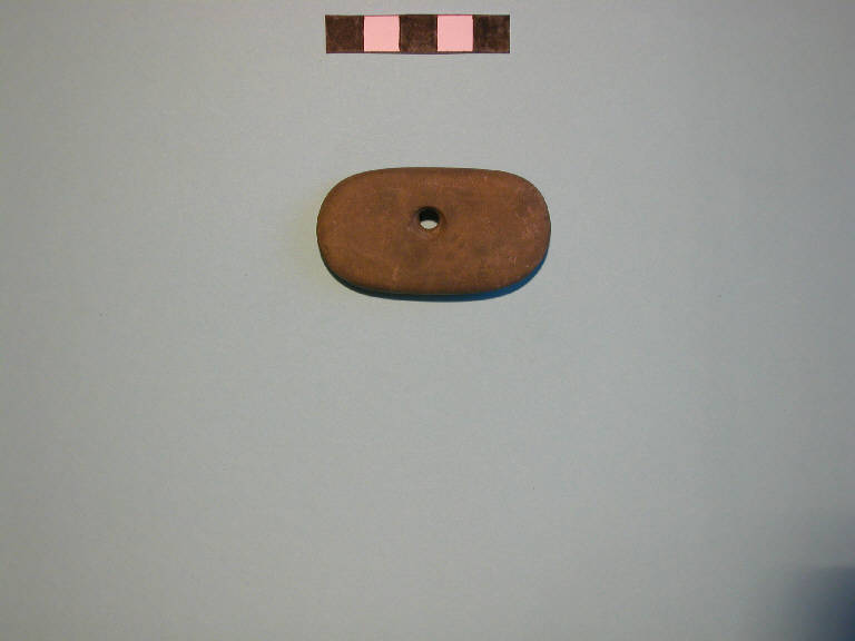 Ciottolo levigato di forma ovoidale (pendaglio?), con entrambe le facce appiattite, con foro passante al centro (diam. 0.5).
