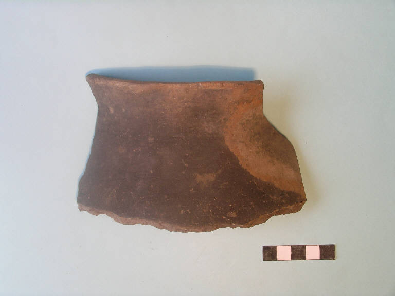 Frammento di porzione superiore di vaso biconico/ovoide, orlo piatto, breve collo distinto leggermente esoverso, parete rettilinea.