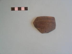 Frammento di scodella carenata, orlo piatto, breve parete verticale rettilinea, carena appena accennata, vasca a profilo leggermente convesso.