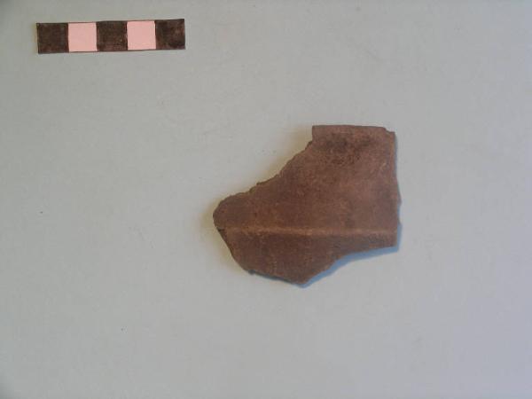 Frammento di scodella carenata, orlo arrotondato, parete verticale concava, carena pronunciata.