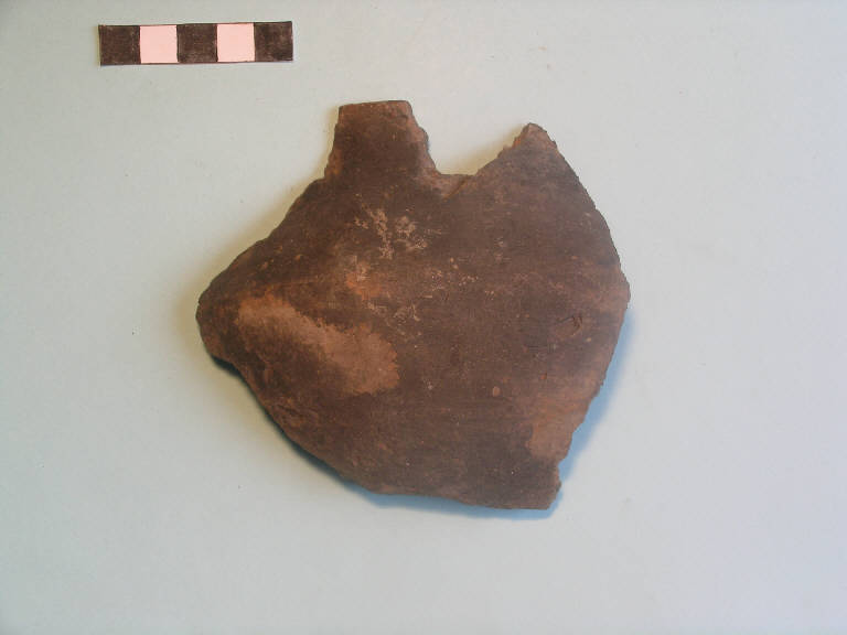 Frammento di scodella carenata, orlo piatto, labbro esoverso, parete rastremata rettilinea, vasca a profilo convesso.