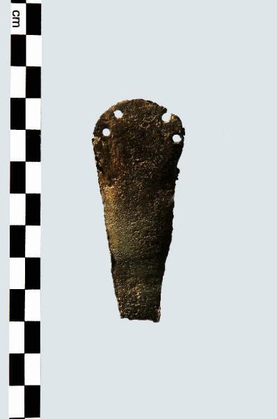Lama di pugnale triangolare con base arcuata con 4 fori per ribattini, disposti 2 a 2 ai margini.