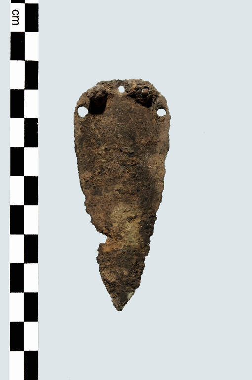 Lama di pugnale triangolare con base debolmante arcuata, 5 fori per ribattini disposti lungo il margine, due ribattini conservati e concrezionati.
