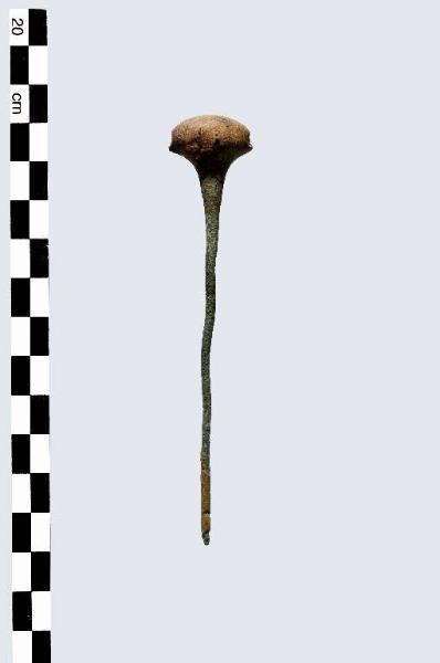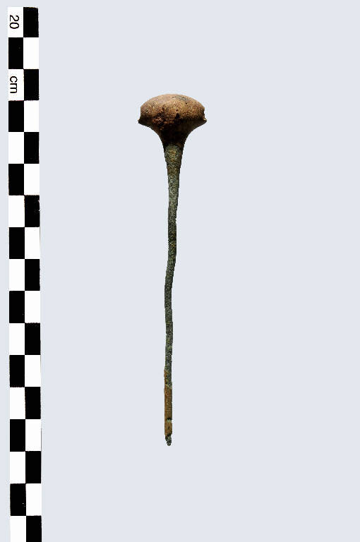 Spillone con testa di forma ovoidale allungata, cava e forata, gambo tozzo e rastremato.