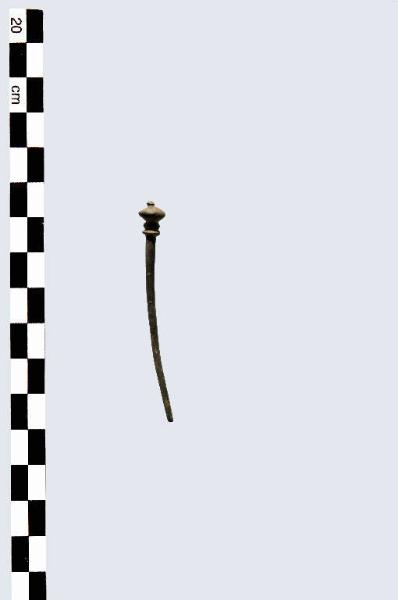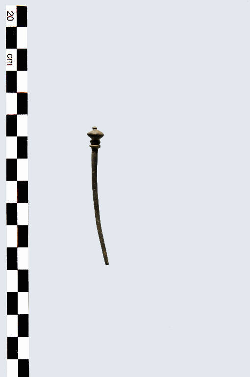 Spillone con testa di forma biconica schiacciata, con piccolo tubercolo apicale e due collari all'innesto del gambo.