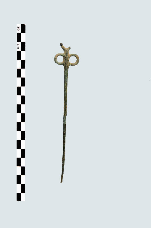 Spillone con testa a tre anelli, uno superiore e due laterali e lungo gambo liscio.