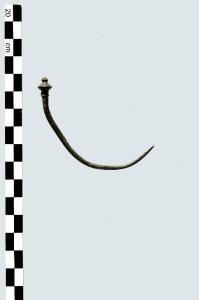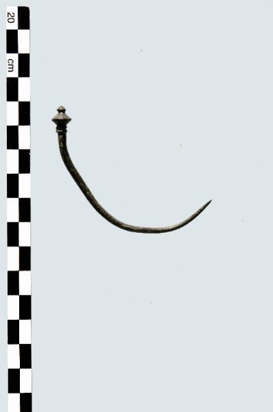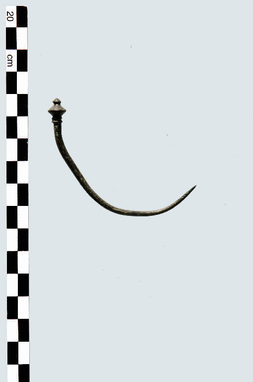 Spillone con testa di forma biconica schiacciata, con piccolo tubercolo biconico apicale e due collari all'innesto del gambo.
