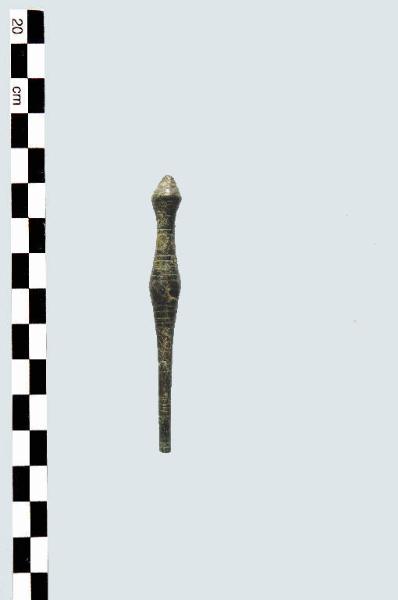 Spillone a testa a mazzuolo di forma biconica, parte superiore del gambo ingrossata e forata, con ricca decorazione incisa a linee orizzontali, delimitanti bande a loro volta campite di motivi a dente di lupo.
