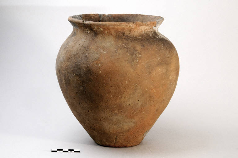 Olla in ceramica comune con orlo estroflesso arrotondato, breve collo concavo, corpo ovoide e fondo piano.