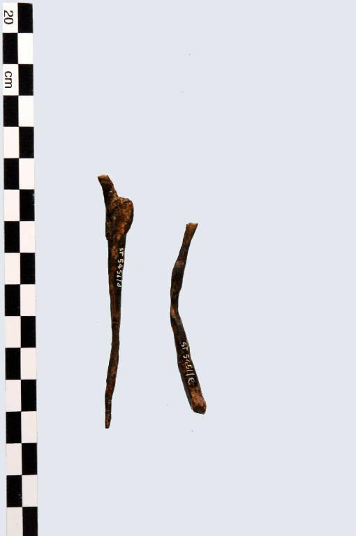 Si tratta di due verghette di ferro pertinenti a fibule; "il manufatto d" è pertinente ad una staffa di fibula MLT (?); "il manufatto e" è probabilmente pertinente ad un ardiglione di fibula di tipologia non definibile.