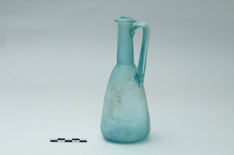 Brocca in vetro soffiato verde chiaro, orlo estroflesso, collo tubolare, ansa scanalata e corpo conico.