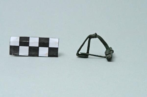Fibula "a balestra", molla a 14 spire, ardiglione breve e arco fortemente piegato
