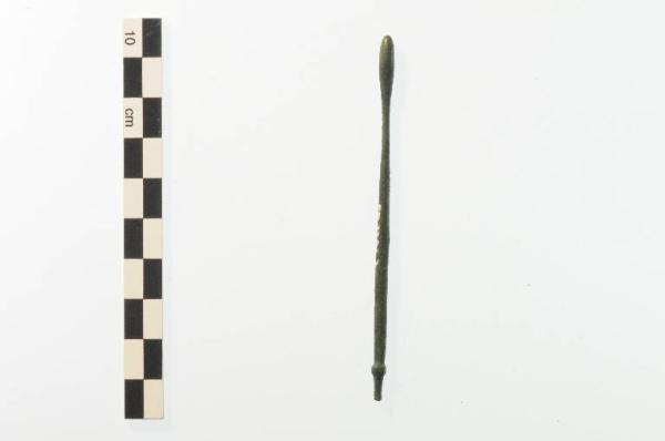 Specillo composto da un'asta a sezione circolare ingrossata ad un'estremità mentre l'altra doveva terminare con una lamina a forma di cucchiaio.L'estremità inferiore è decorata da un globetto a rilievo.