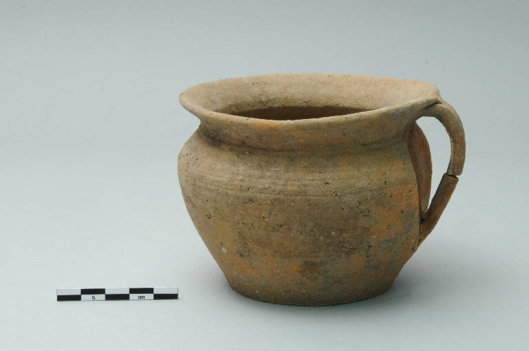 Boccale di tipo retico caratterizzato dalla depressione funzionale della parete in corrispondenza dell'ansa a nastro, orlo svasato e base piana.
