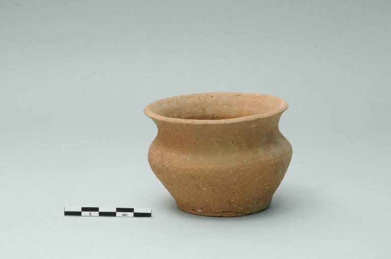Bicchiere globulare in ceramica comune per forma e impasto riferibile al gruppo di boccali di tipo retico caratterizzati dalla depressione all'altezza dell'ansa.