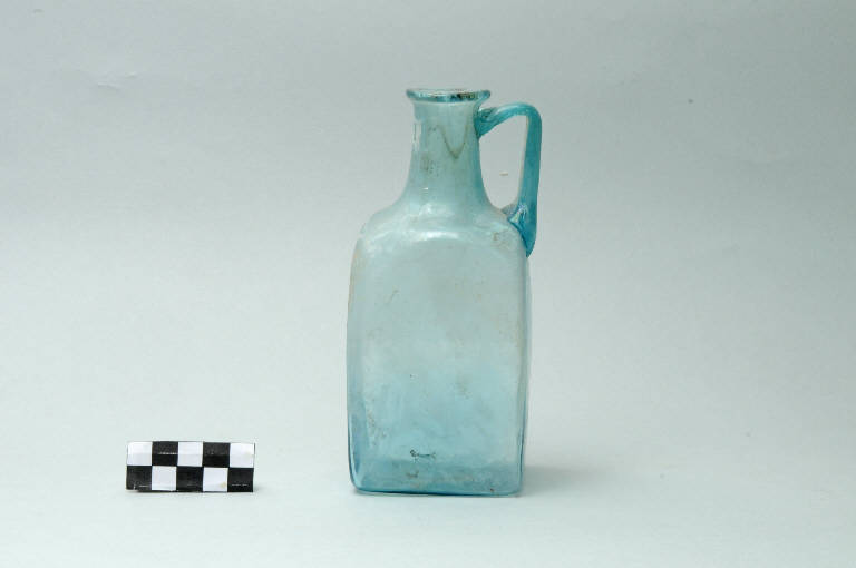 Bottiglia monoansata in vetro soffiato verde-azzurro, orlo ingrossato, ansa a nastro ripiegata ad angolo acuto e ventre a sezione quadrata.