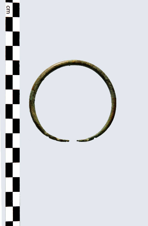 Armilla in bronzo di forma circolare aperta, le parti terminali risultano schiacciate e decorate a rilievo con un motivo geometrico.