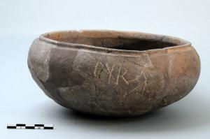 Ciotola in argilla grezza ad impasto grigio, orlo irregolare ripiegato verso l'esterno distinto dalla spalla mediante un gradino.