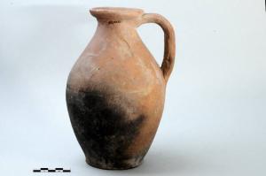 Olpe a bottiglia con corpo allungato, orlo estroflesso sotto cui si imposta un'ansa a gomito terminante sulla spalla, fondo piano.
