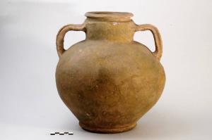 Anforotto biansato, orlo estroflesso a profilo triangolare, modanatura rilevata tra orlo e collo, due anse a nastro costolate, spalla rilevata e piede ad anello