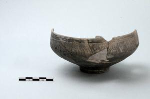 Coppa a pareti sottili caratterizzata da impasto grigio, carena alta che si restringe all'orlo modanato, sotto il quale è impostata una decorazione a strigilature parallele che si conclude all'altezza della spalla, piede ad anello rilevato.