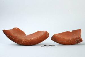 Orlo di patera a tesa sulla quale è presente una decorazione à la barbotine con volute, grappoli e motivi floreali.
