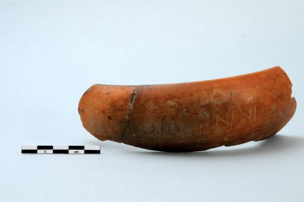 Coppa emisferica in terra sigillata, orlo rientrante e piede ad anello.