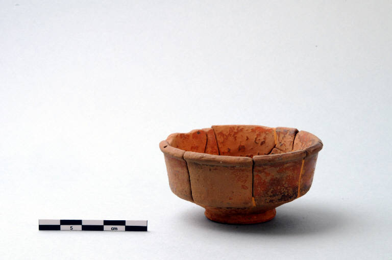 Coppetta in terra sigillata carenata, parete verticale con orlo ingrossato e ribattuto verso l'esterno, piede ad anello. Resta traccia del bollo in planta pedis impresso nel fondo interno.