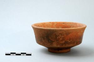 Coppetta in terra sigillata carenata, parete leggermente obliqua con orlo ingrossato e ribattuto verso l'esterno, piede ad anello.