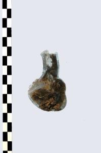 Balsamario in vetro verde, orlo estroflesso, collo cilindrico e corpo sferico.