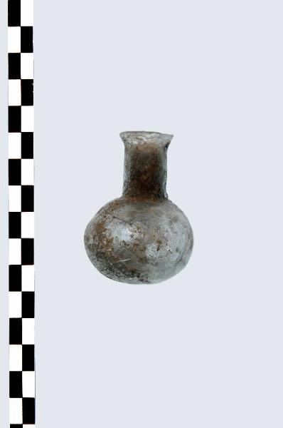 Balsamario in vetro naturale molto sottile, labbro leggermente estroflesso collo leggermente allungato, e corpo sferico.