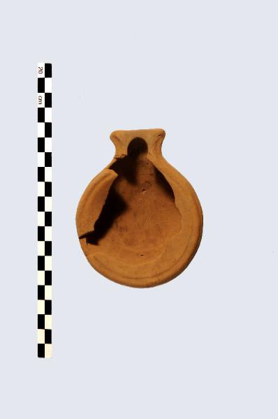 Lucerna con corpo circolare, disco ampio e leggermente incavato. Brevissimo becco a incudine.