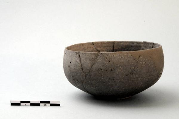 Coppetta in argilla grigia sabbiata, orlo dirit, vasca arrotondata con una solcatura circolare incisa a metà di essa, piccolo piede a disco.