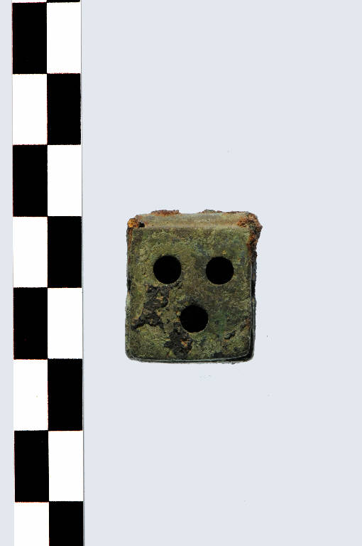 Piccola scatola bronzea brucia profumi di forma rettangolare, tre fori sulla superficie superiore e due fori sui lati lunghi. La cerniera è composta da un perno in ferro.