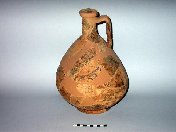 Olpe in ceramica comune depurata con orlo arrotondato, ansa a nastro con quattro costolature e piede ad anello.