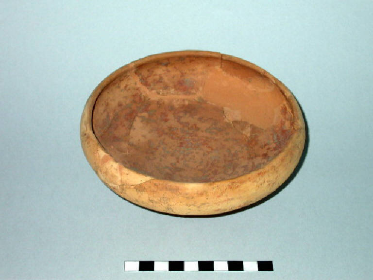 Esemplare parzialmente ricostruito di coppa in terra sigillata di produzione padana appartenente al corredo della tomba n.7 della necropoli delle Quintane, presenta un orlo rientrante, piede ad anello e fondo leggermente ombelicato .