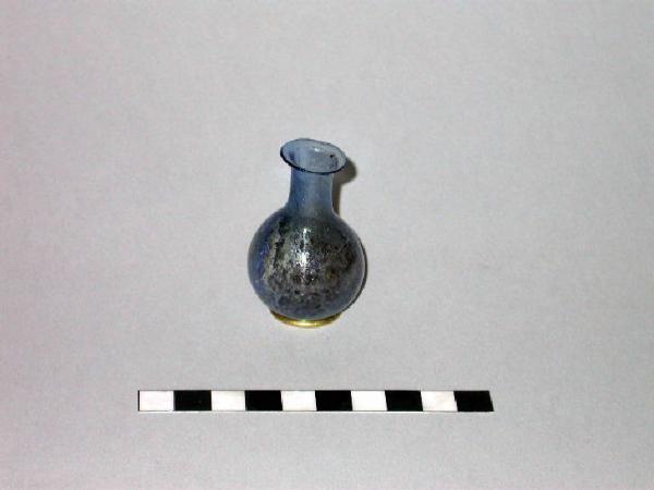 Balsamario in vetro blu con orlo estroflesso, collo cilindrico e corpo globoso.