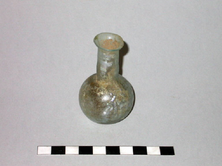 Balsamario in vetro grigio - azzurro con orlo estroflesso, collo cilindrico e corpo globoso.