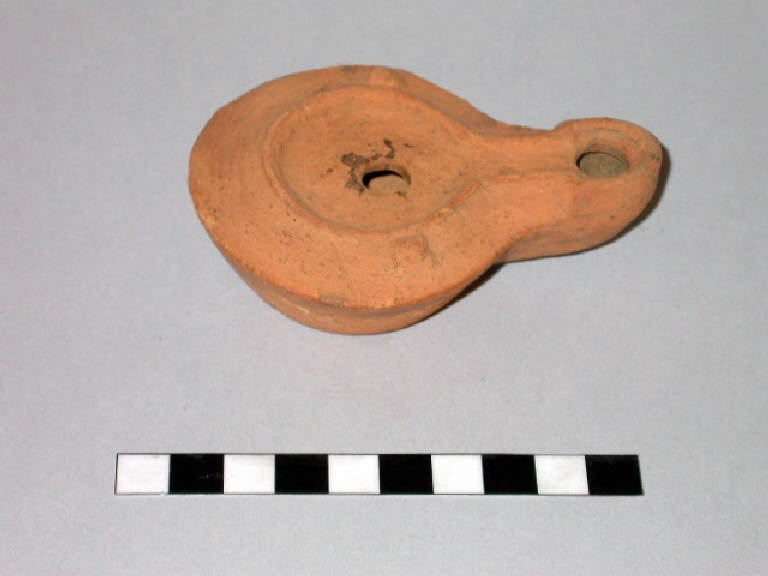 Lucerna a canale aperto con due borchiette sulla spalla e un anello inciso sul fondo