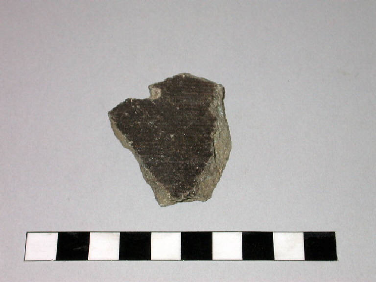 Frammento di parete di vaso cilindrico in pietra ollare; all'esterno presenta fitte solcature orizzontali e tracce di un foro passante circolare.