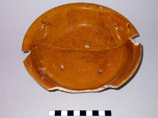 Esemplare ricostruito di ciotola in ceramica ingobbiata, monocroma gialla ed invetriata con orlo piatto leggermente estroflesso, vasca emisferica e piede a disco