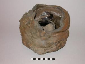 Cassetta cilindrica in materiale refrattario per la cottura di manufatti a cui doveva essere fissato il rivestimento (smalto o vetrina) in seconda cottura.