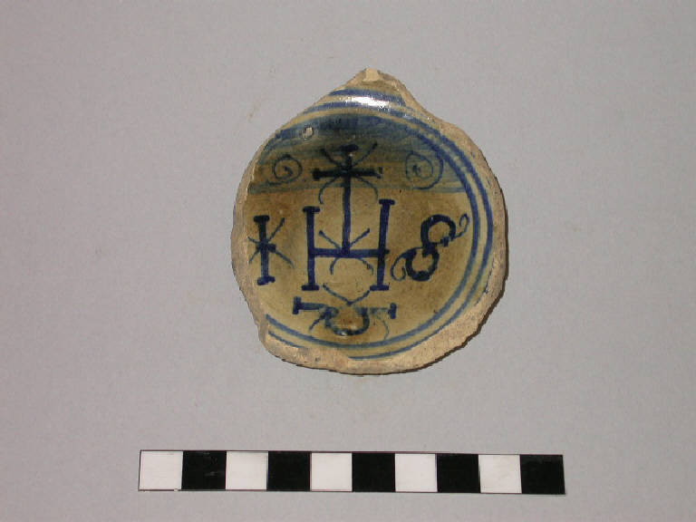 Frammento di coppetta in maiolica con fondo con piede a disco leggermente concavo