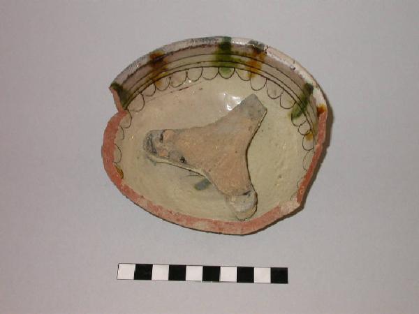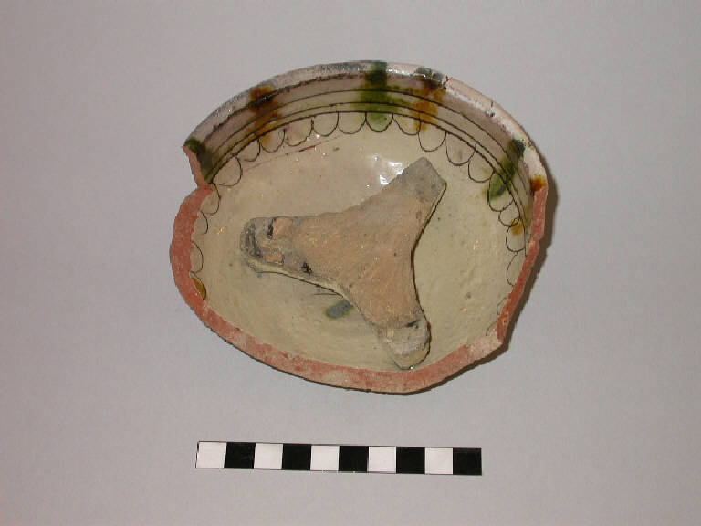 Ciotola frammentaria in ceramica ingobbiata, graffita a punta, verniciata e conserva il piede distanziatore ancora saldato