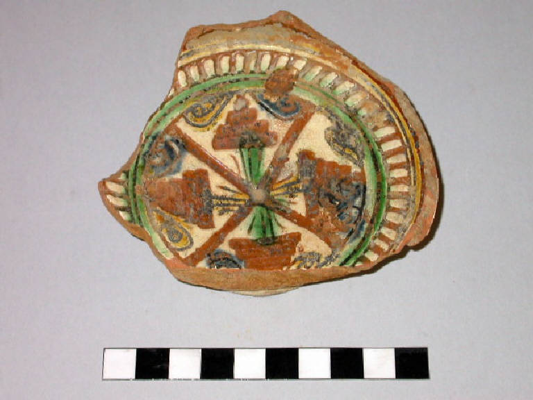 Piatto mutilo in ceramica ingubbiata e graffita von orlo estroflesso aggettante