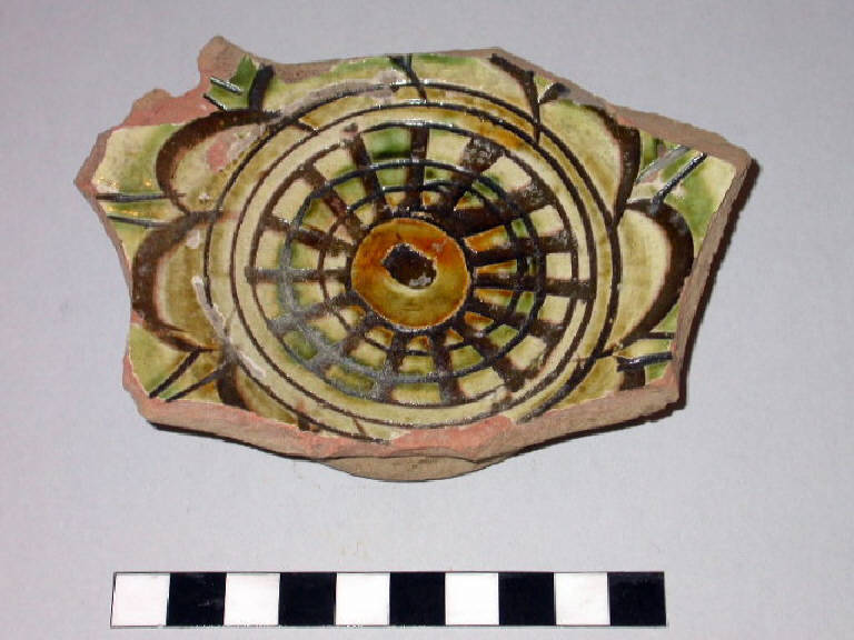 Frammento di scodellone in ceramica ingobbiata e graffita con piede a disco