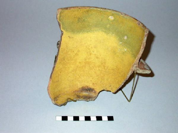 Esemplare frammentario di pentola da cucina economica (stufa) in ceramica invetriata con orlo indistinto verticale, corpo troncoconico e fondo piano. Presenta due anse orizzontali (una delle quali perduta) impostate sotto l'orlo ed al di sopra del listello orizzontale che serviva all'incastro della pentola sul fornello. Superfici esterne nude ed interne invetriate in giallo