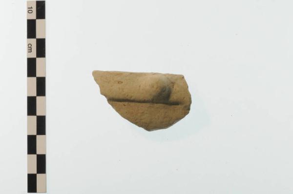 Frammento di ciotola ad orlo ingrossato con sezione a mandorla, leggermente introflesso.